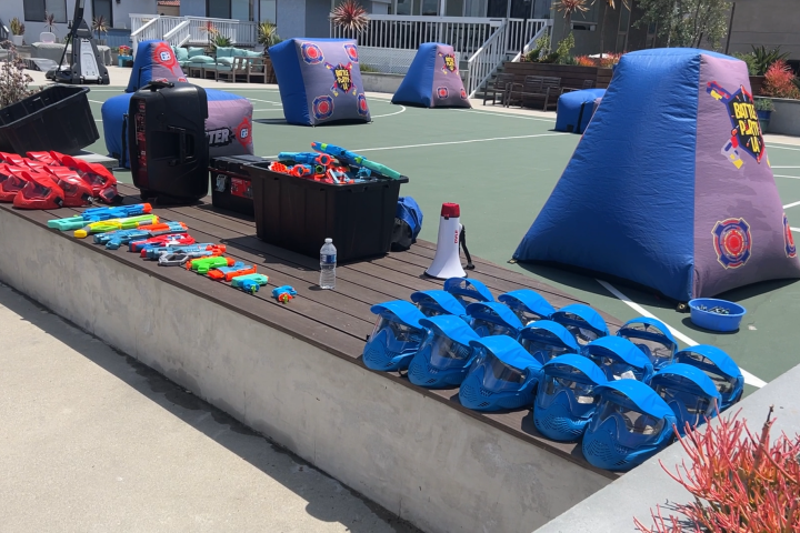 A fully staffed event with background checked & first aid/CPR trained staff including all necessary equipment such as a variety of Nerf blasters, ammo, large inflatable battlefield, sanitized protective gear, multiple game modes, custom music with speaker system all combine into an unforgettable high energy event!